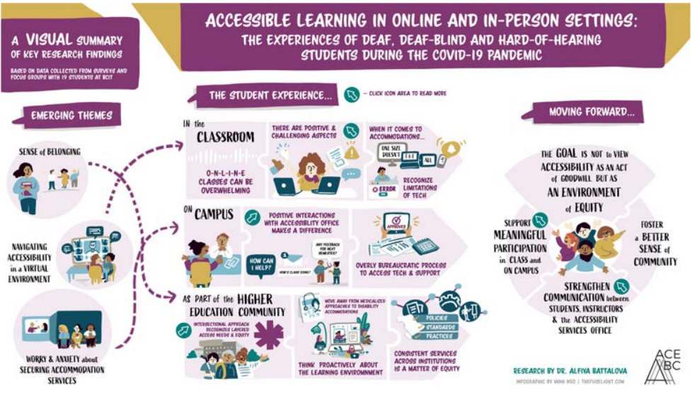 The summary of the research project is seen here, in an interactive infographic created by Fuselight Creative and made accessible by Scribely with an audio description of the interactive journey of the key findings. A text version in MS Word also accompanies the infographic.